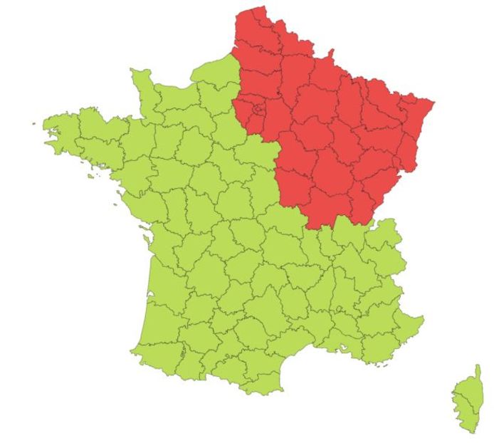 In totaal kleuren nu al 21 Franse departementen rood. De overige departementen zijn rood of oranje. Het is de oudste verticale driekleur van de wereld.